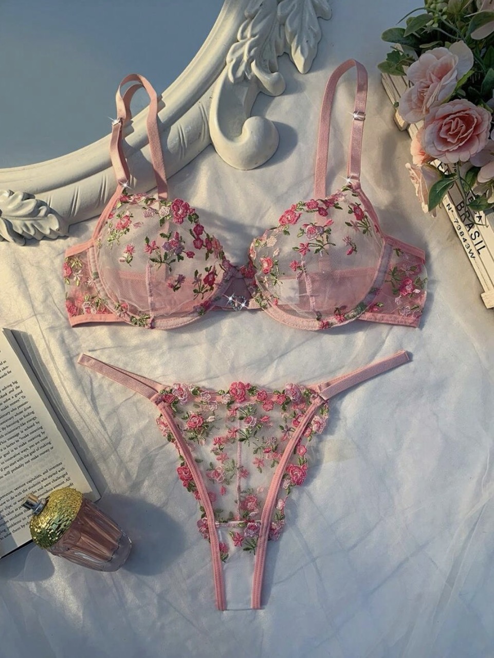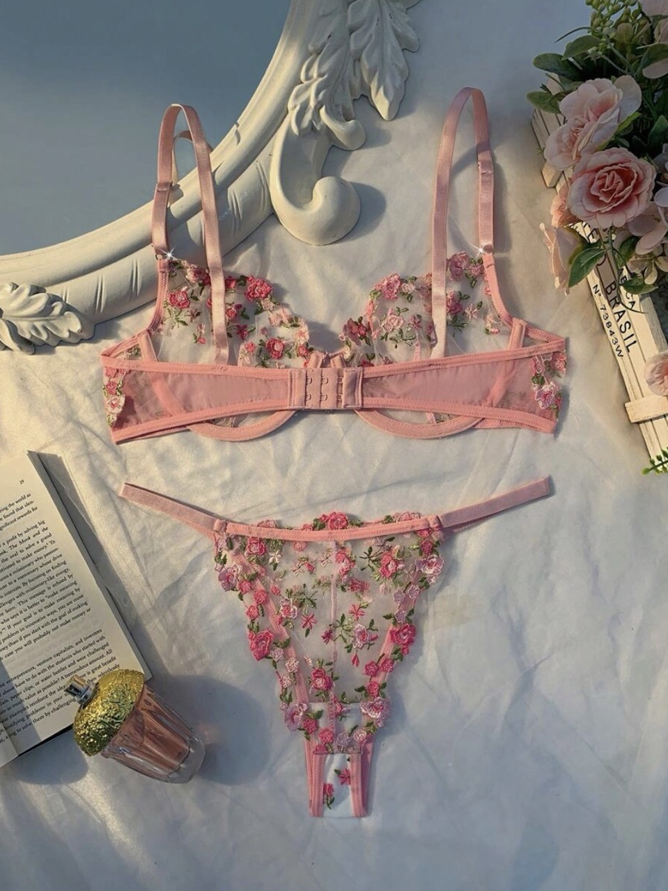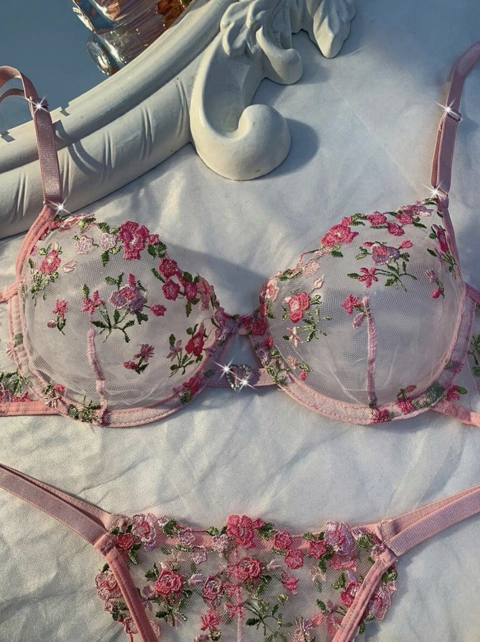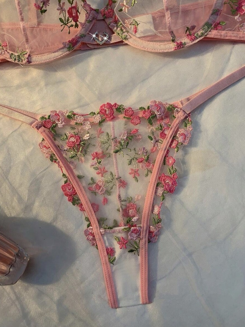 ست لباس زیر زنانه ۲ تکه شامل لباس زیر جذاب با تزئین نگینهای قلبی و گلدوزی ظریف.